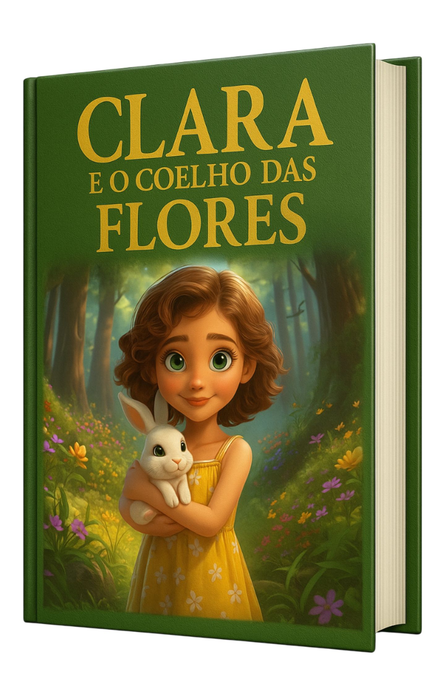 Clara, uma menina de vestido pastel e chapéu de palha, segura uma cesta cheia de flores coloridas, sorrindo alegremente.